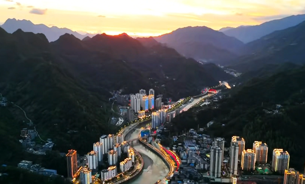 近日,城口一位摄影爱好者拍下傍晚时分晚霞美景,染红的天际映衬着山脉,与城市初上的华灯相互辉映。