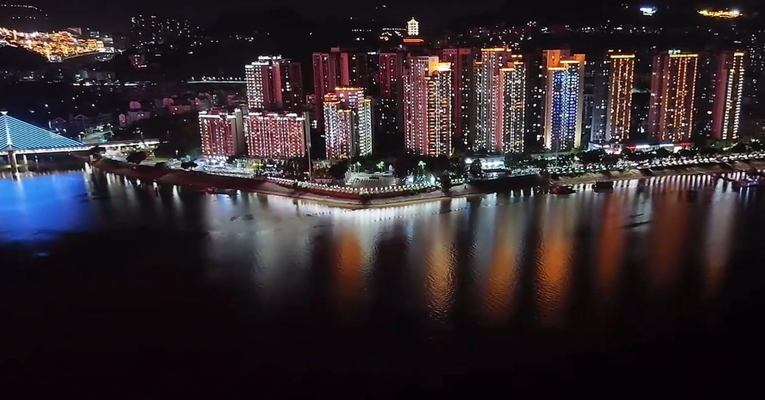 三峡库区175米蓄水后,长江万州段水位满格,江面如镜,映照都市繁华,三峡平湖旅游区夜景华丽升级。
