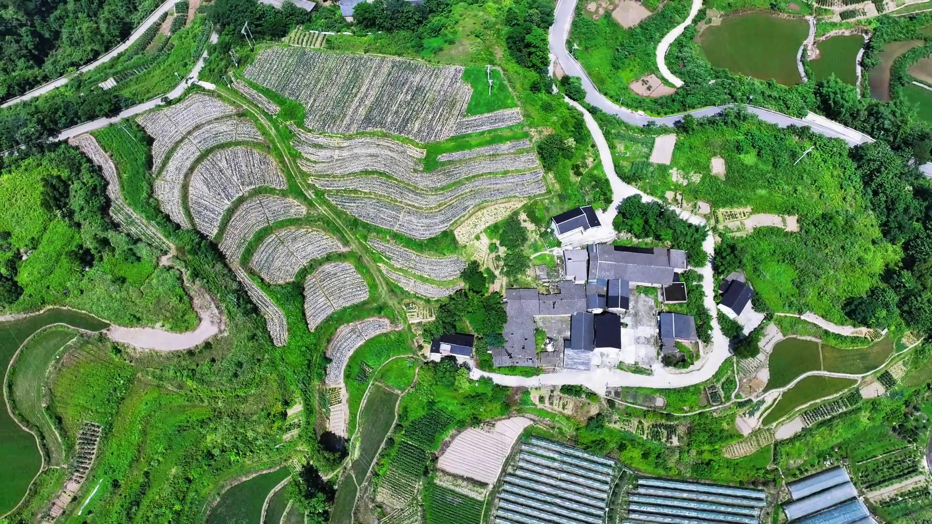 初夏时节,田野里的水稻已经种下,从高空俯瞰,层层叠叠的田垄间,农民在辛勤劳作,阳光洒落下,呈现出斑斓的色彩。蜿蜒的梯田与道路、村舍、蓝天白云等交相辉映,构成一幅美丽的乡村振兴画卷。