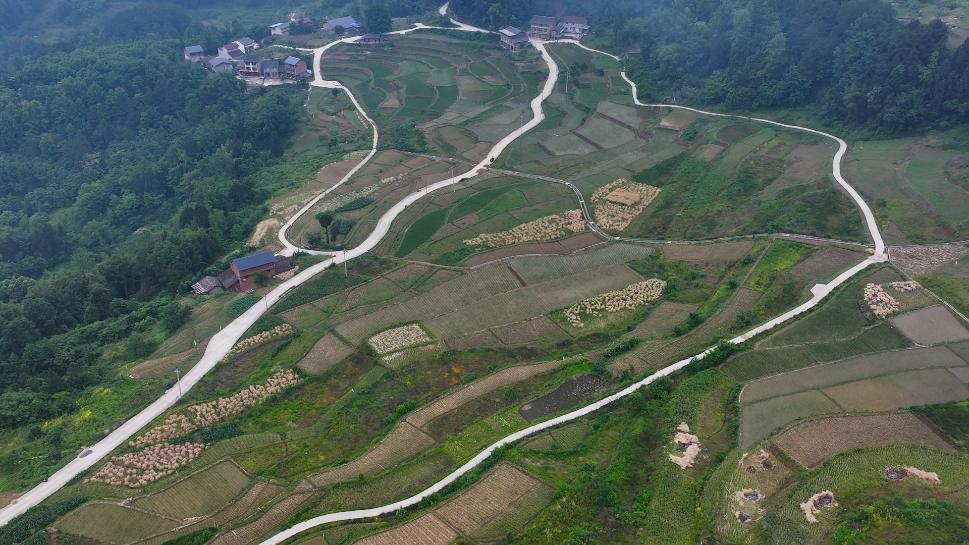 仲夏时节,忠县黄金镇大岭山层层叠叠的梯田上新绿盈野,构成了一幅天然田园画卷。