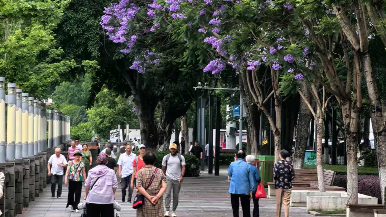 近日,万州城区的蓝花楹迎来盛花期,为市民们装扮出如梦似幻的美丽风景。在北滨大道三段音乐广场一带,一株株蓝花楹高大挺拔,树冠上团团簇簇的蓝紫色花朵层层叠叠,如紫云般绚丽。每天早上,不少市民趁着花期,前来这里散步、拍照打卡,享受这份大自然馈赠的美好。