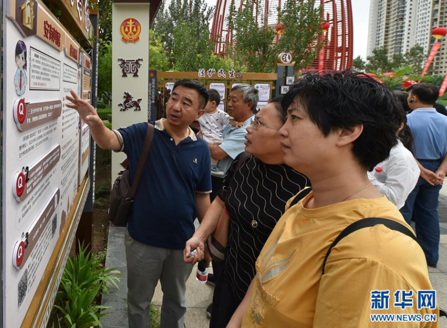 8月20日,在天津市津南区海河故道公园民法典主题长廊,市民在讨论主题长廊展板上的法律案例。