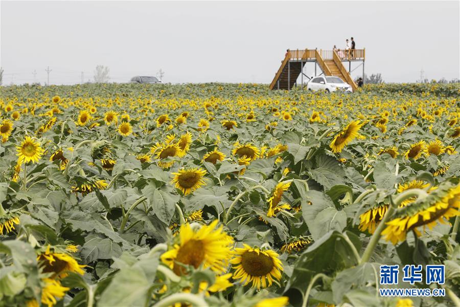 近日,河南省宝丰县龙王沟乡村振兴示范区种植的近2000亩油葵进入盛花期,金黄色的花海吸引游客前来观赏游玩。