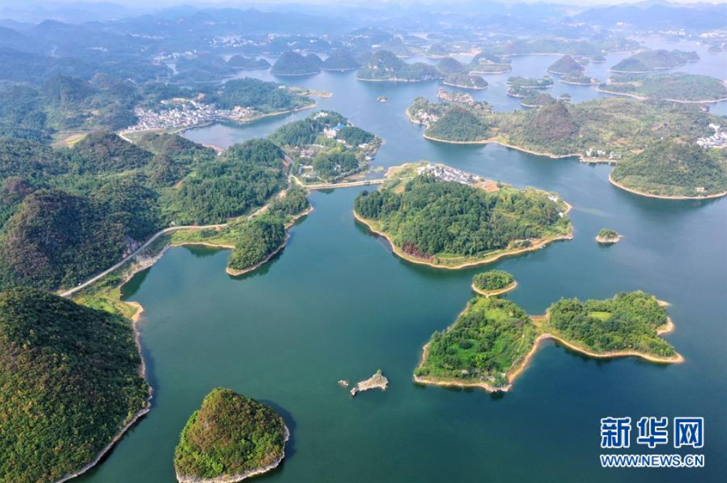 8月31日拍摄的百花湖风光。 秋日时节,贵阳市百花湖百余个岛屿峰峦起伏,呈现出一幅美丽画卷。