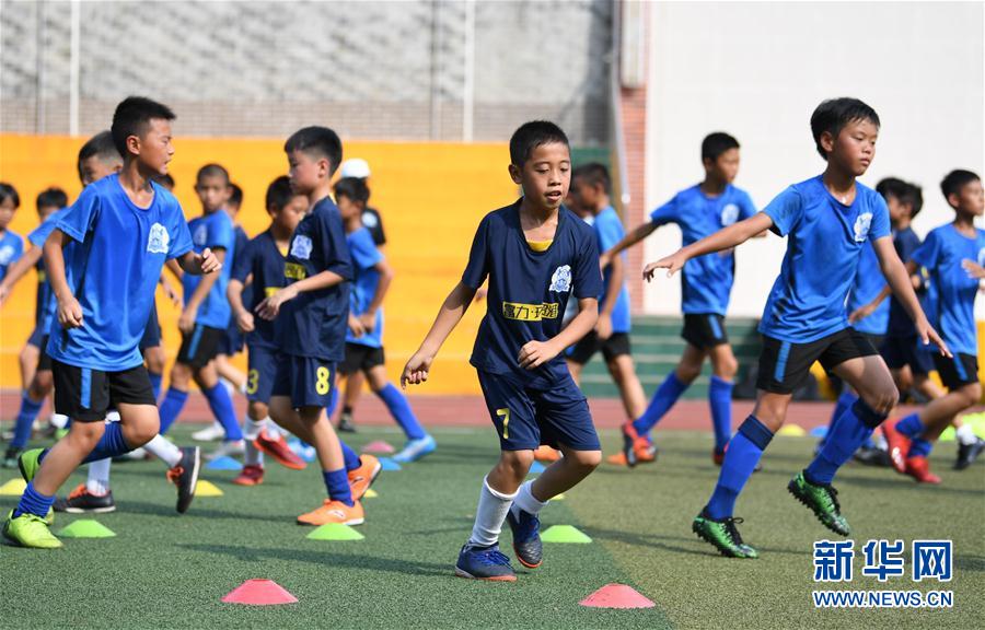 8月10日,广州富力青训精英学堂U11梯队学员和吉山小学学生在合练中进行体能训练。