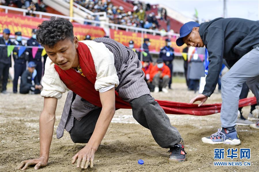 8月10日,2020年那曲羌塘恰青格萨尔赛马艺术节在西藏那曲市格萨尔赛马场开幕,来自那曲各县区的农牧民在赛马场参加了抱石头比赛和押加赛。