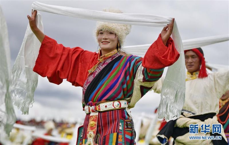 8月10日,演员在2020年那曲羌塘恰青格萨尔赛马艺术节开幕式上表演节目。 当日,2020年那曲羌塘恰青格萨尔赛马艺术节在西藏那曲市格萨尔赛马场开幕。