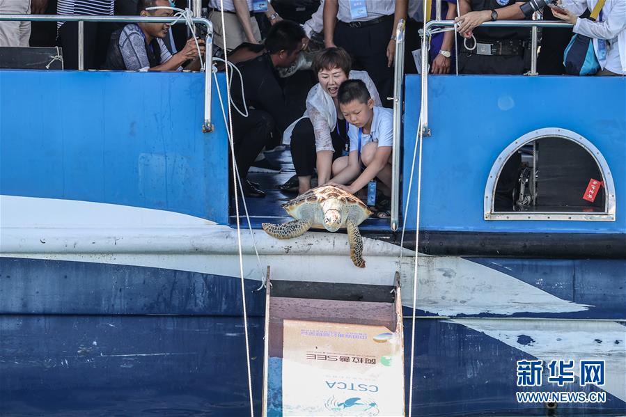 8月9日,在海南陵水县分界洲岛附近海域,志愿者在放流海龟。