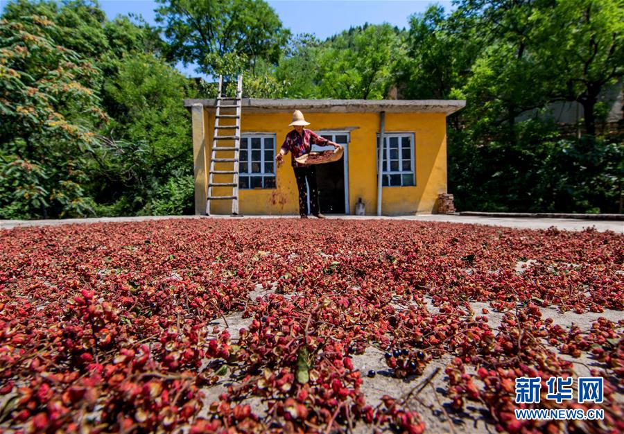 8月9日,武安市徘徊镇后李甲村农民在花椒种植基地采摘花椒。