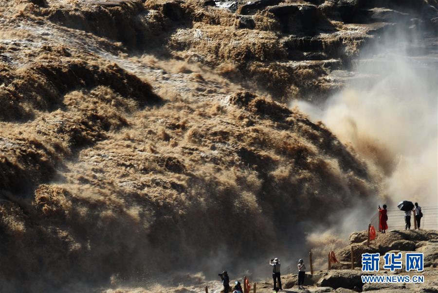 8月10日,游客在山西吉县黄河壶口瀑布景区欣赏洪峰过后的壮美瀑布群。