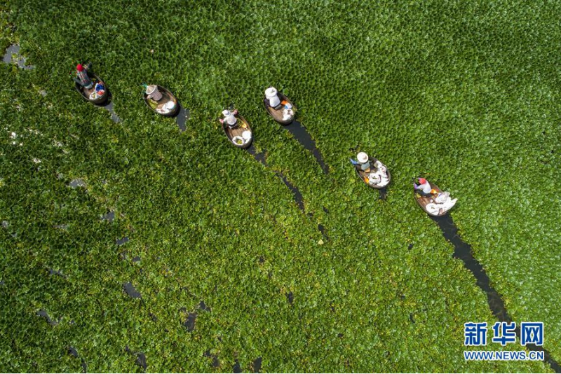 8月2日,南舍村村民划着菱桶采摘菱角(无人机照片)。 盛夏时节,江苏省泰州市农业开发区南舍村的菱角进入成熟季,村民忙着采摘菱角,成为水乡特有的丰收景象。