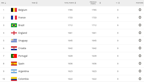 FIFA新一期排名:比利时稳居世界第一 国足亚洲第九