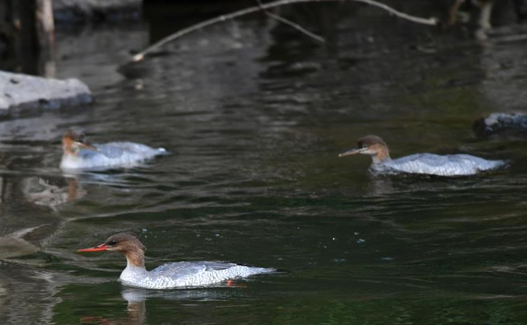 7月7日,几只中华秋沙鸭在长白山国家级自然保护区头道自然保护站水域戏水。 近日,吉林省长白山国家级自然保护区头道自然保护站发现十余只国家一级重点保护动物中华秋沙鸭。