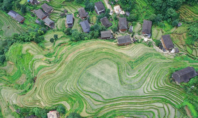 这是龙胜各族自治县龙脊镇江柳村的梯田(7月7日摄,无人机照片)。 夏日时节,广西龙胜各族自治县境内梯田秧苗青青,景色宜人。