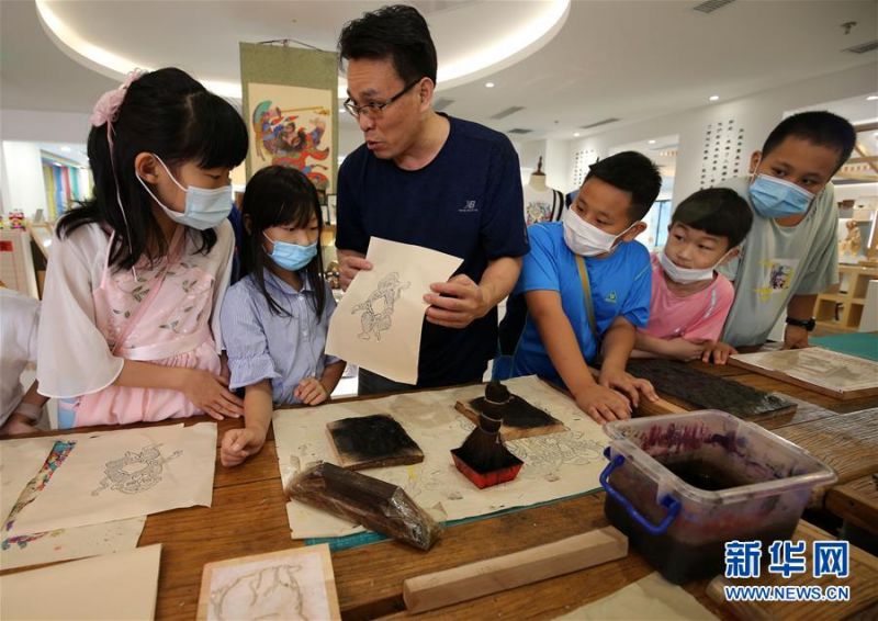 7月8日,山东省潍坊市潍城区城关街道十笏园社区的小朋友在了解木版年画的印制。