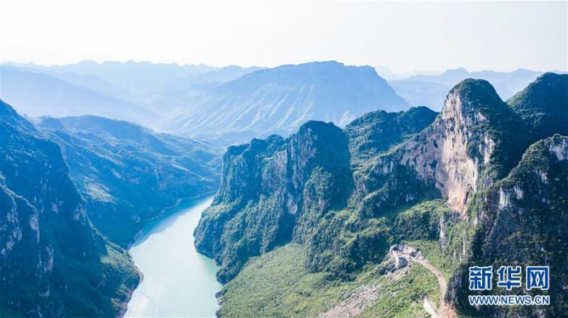 7月6日拍摄的六枝特区牂牁江风景区风光(无人机照片)。 夏日时节,贵州省六盘水市六枝特区牂牁江风景区草木苍翠,江水碧蓝,美景如画。