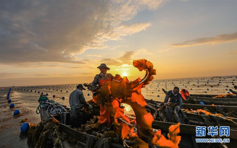 6月30日清晨5时许,在山东省荣成市荣成湾一处海带养殖区,工人们迎着朝阳收割海带。 新华社发(李信君 摄)