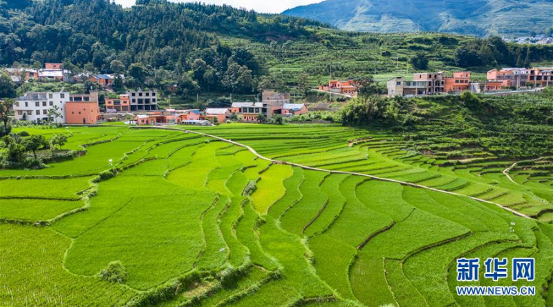 贵州省盘州市新民镇的梯田风光(6月29日摄,无人机照片)。 夏日时节,贵州省盘州市新民镇的梯田风景如画。 新华社记者 陶亮 摄