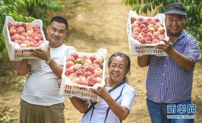 6月29日,河北省永清县后奕镇石各庄村果农在搬运刚采摘的鲜桃。