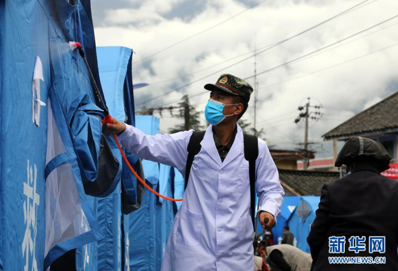 6月29日,武警四川总队凉山支队医疗小分队队员在冕宁县曹古安置点开展消杀防疫工作。