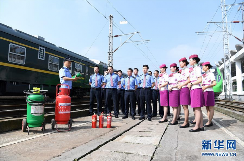 6月29日,重庆铁路公安处消防支队民警(左一)向铁路职工讲解消防器材使用方法。