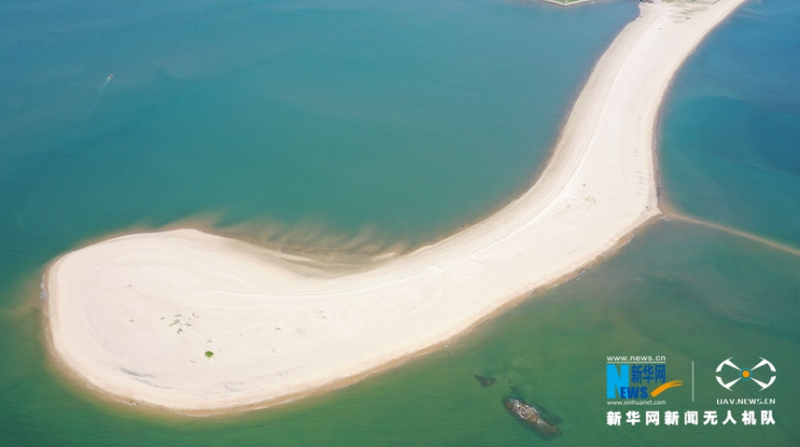 “触角沙滩”沙质纯净、细腻,宛如一条玉带铺陈在海面(无人机拍摄)。新华网 王雄 摄 飞手 林楷煜