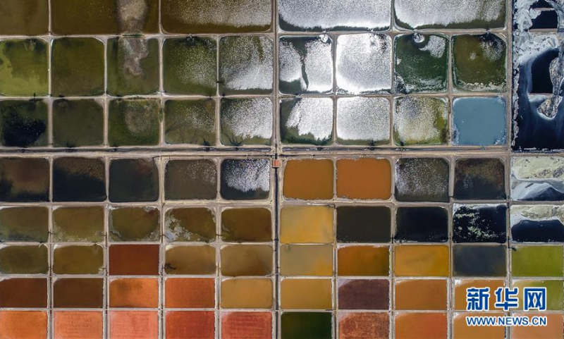 6月15日在山东省荣成市港西镇拍摄的一处盐田(无人机照片)。 盐田的水在高温下不断蒸发,浓度变大,呈现出色彩斑斓的独特景象,宛如一张巨大的调色板。