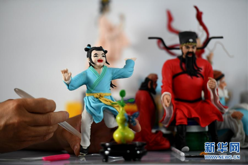 6月11日,在河北省石家庄市深泽县职业技术教育中心,民间艺人王亮展示自己创作的面塑作品。 深泽面塑是当地有名的民间手工技艺,传承历史悠久。石家庄市深泽县民间艺人王亮自幼酷爱手工,他专注面塑创作20多年,推出历史神话人物、十二生肖、田园风光等作品。近年来,王亮致力于传承面塑民间技艺,将其带到20多个国家和地区进行文化交流,让更多人接触、了解到中国传统民间艺术。