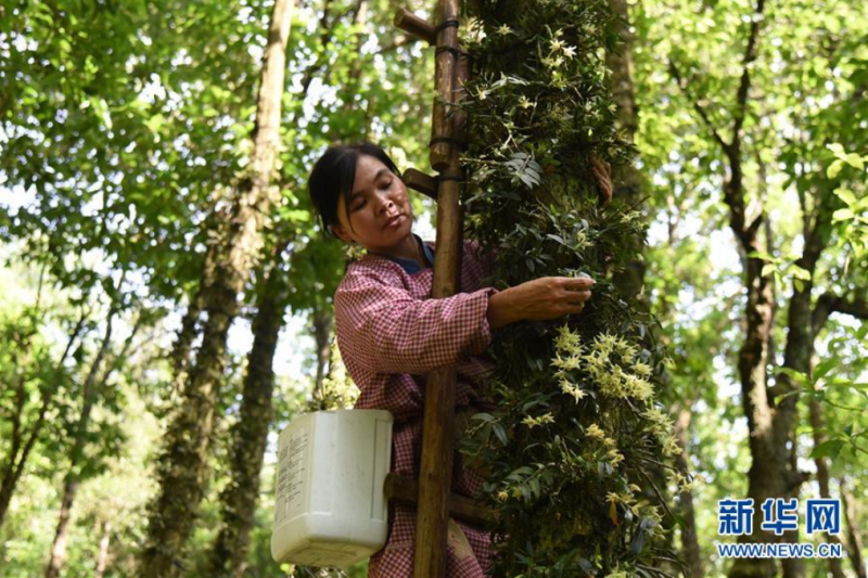 6月8日,村民在树上采摘铁皮石斛花。 近年来,贵州省安龙县者贵村利用当地气候和森林资源优势,发展中药材铁皮石斛种植,通过就近务工、产业分红等方式带动群众增收。