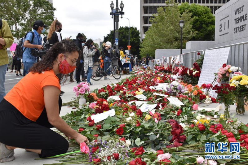 这是6月5日在美国洛杉矶一场抗议示威活动上拍摄的人们摆放的鲜花。 因弗洛伊德事件引发的抗议示威浪潮5日在美国洛杉矶持续。