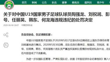 中国足协公布对陶强龙等六名国青球员的处罚决定