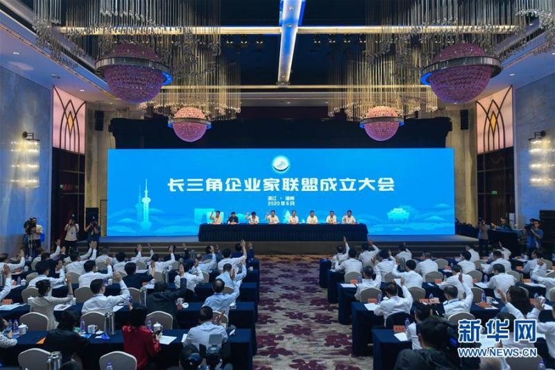 6月5日在浙江湖州拍摄的长三角企业家联盟成立大会现场。 当日下午,长三角企业参与一体化战略的服务平台——长三角企业家联盟在浙江湖州举行成立大会,这是推动长三角企业参与一体化发展的一项重大标志性成果。