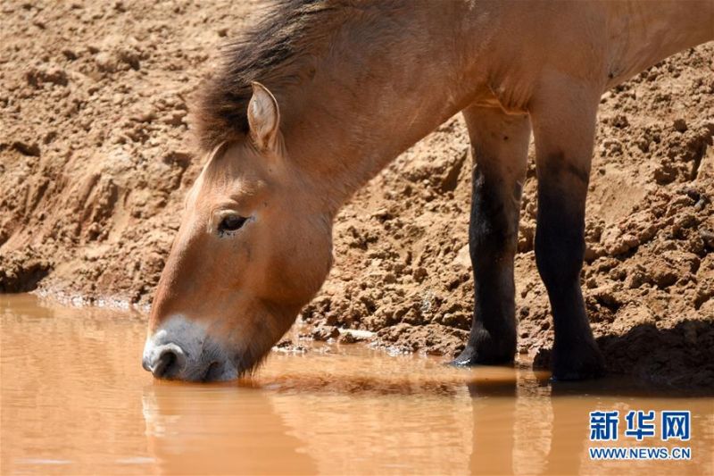 在新疆卡拉麦里山有蹄类野生动物自然保护区,一匹普氏野马在水源地饮水。