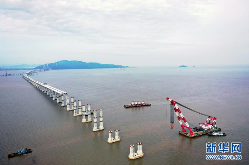 6月2日拍摄的在建中的舟岱大桥项目主通航孔桥(无人机照片)。 在浙江省舟山市定海区马目海域,在建中的舟岱大桥初现雏形,各标段正全力冲剌。据了解,截至2020年5月底,浙江省交通集团宁波舟山港主通道项目工程中的舟岱大桥项目已累计完成形象进度76%。