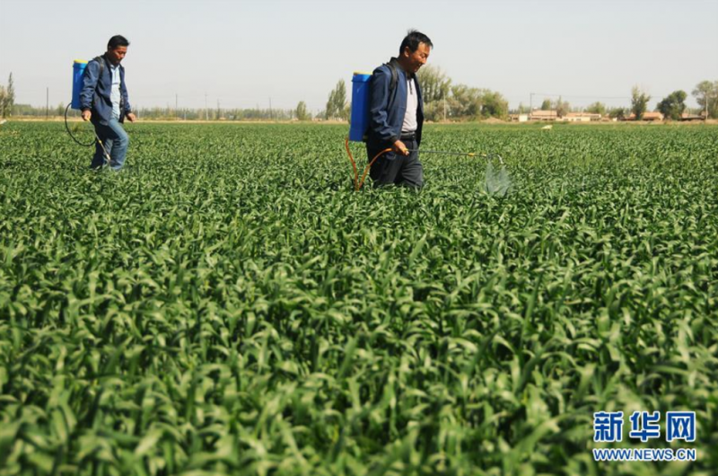 5月28日,内蒙古巴彦淖尔市临河区干召庙镇棋盘村村民在麦田中喷药防治病虫害。