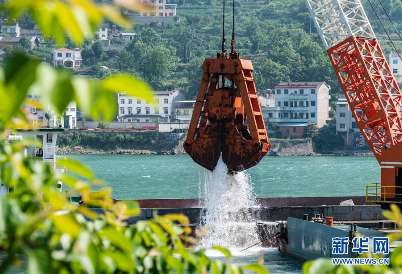 5月30日,施工船舶在三峡大坝下游莲沱水域清除航道内阻碍航行的礁石。