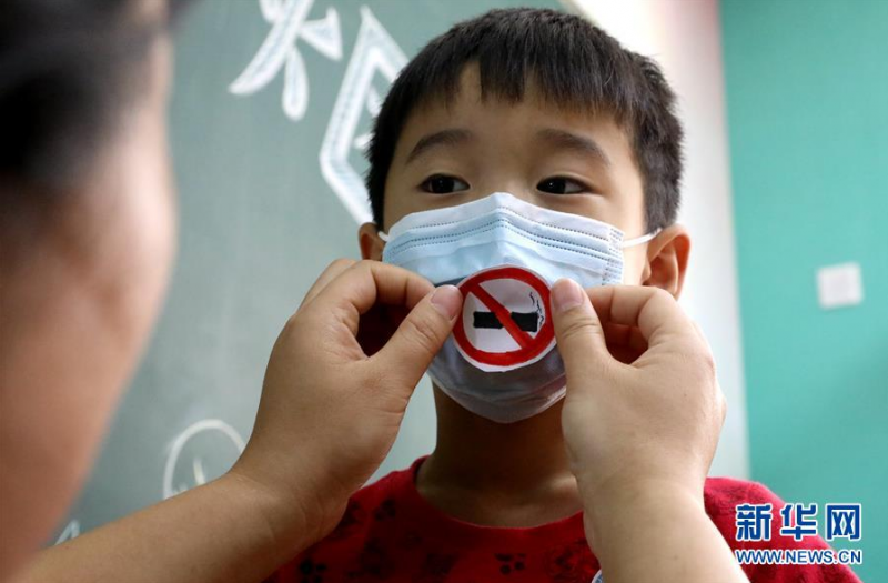 5月30日,在石家庄市桥西区振头街道盛世御城社区,工作人员帮助小朋友戴禁烟标志口罩。