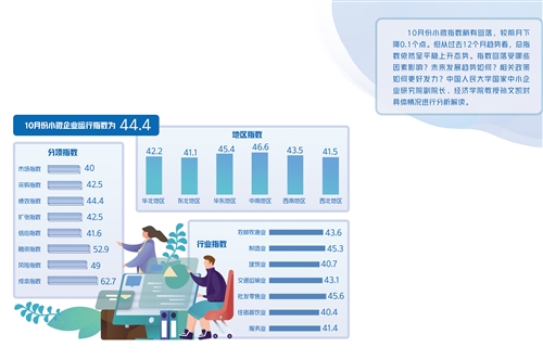 10月份,“经济日报—中国邮政储蓄银行小微企业运行指数”为44.4,较前月下降0.1个点。自2020年10月份以来,小微企业运行指数稳中有升,近几个月虽然略有波动,但没有改变总体复苏态势:市场指数、绩效指数呈现不断复苏趋势,信心指数、采购指数、扩张指数和风险指数在一定水平上波动,融资指数和成本指数则持续在景气线之上,反映了小微企业融资环境持续好转,综合成本持续下降。