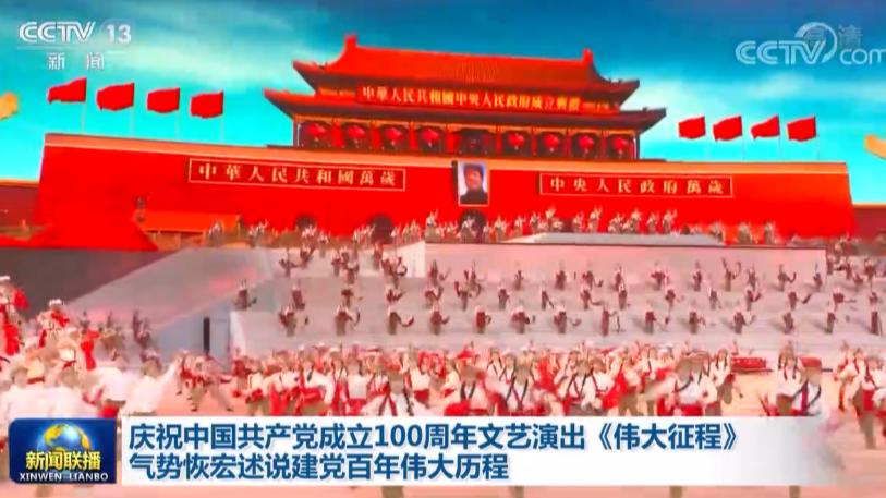 庆祝中国共产党成立100周年文艺演出《伟大征程》以大型情景史诗形式呈现,新时代的艺术家们综合运用多种艺术手段和最新的演艺科技,生动展现了中国共产党百年来波澜壮阔的光辉历程,带领中国人民迈进新征程、奋进新时代的壮丽画卷。