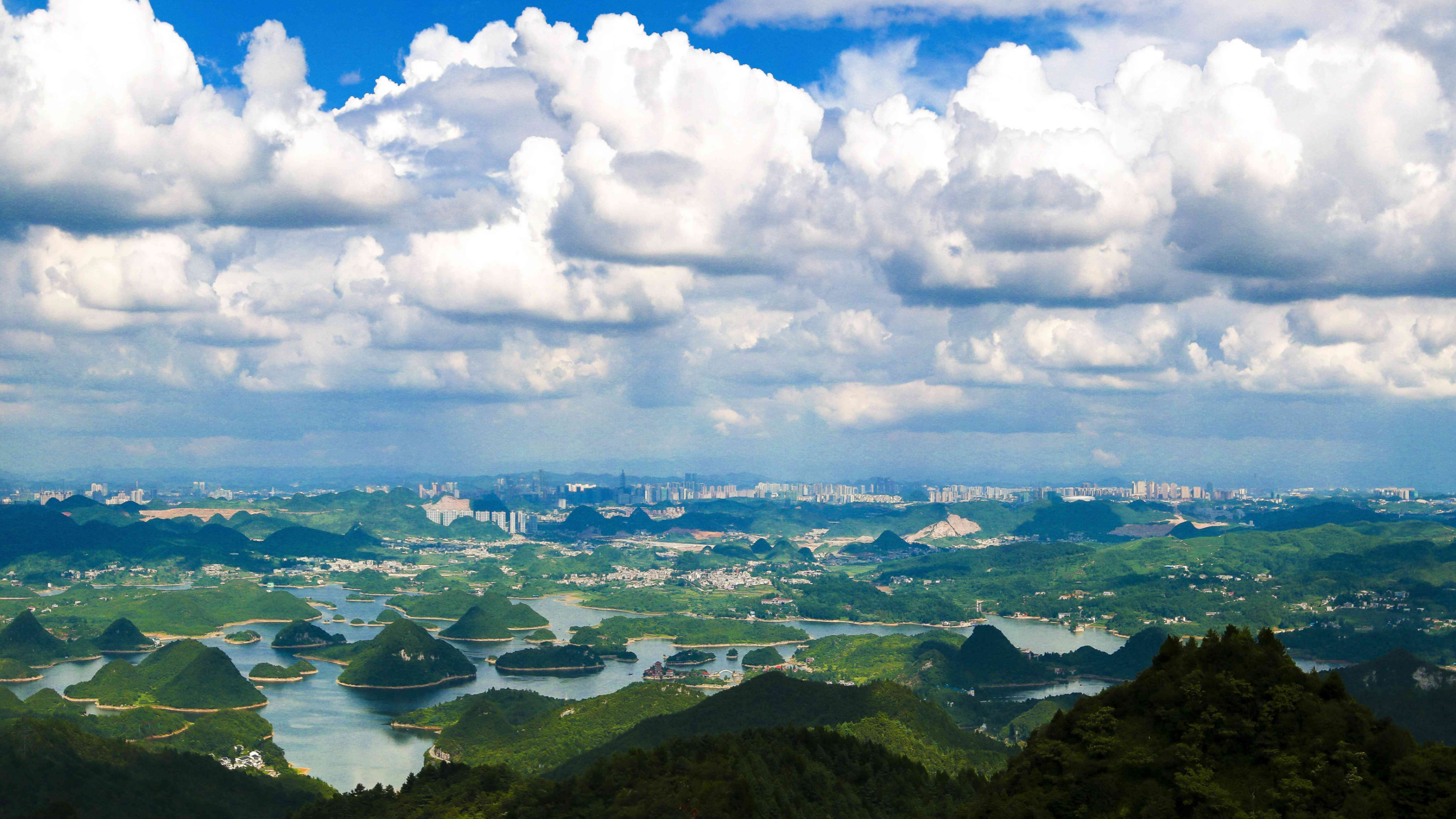 7月的六盘水市明湖国家湿地公园,澄清的湖水与远处的山体相连,群山换上了翠绿的新装,群鸟竞相在湖面上嬉戏,蓝天、白云、青山、绿水相得益彰,“生态”一词在这里诠释得具体而生动。