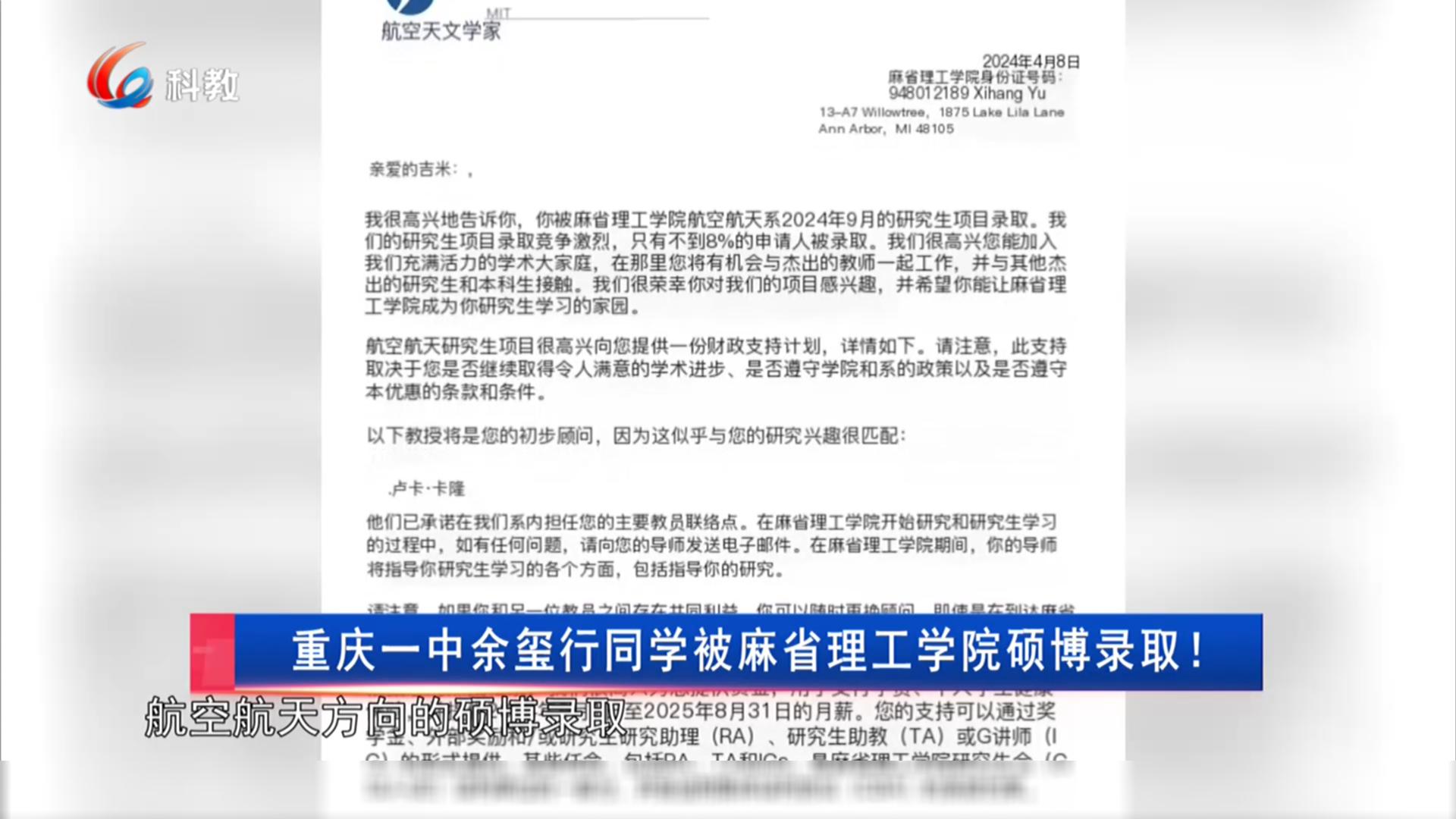 重庆一中余玺行同学被麻省理工学院硕博录取!