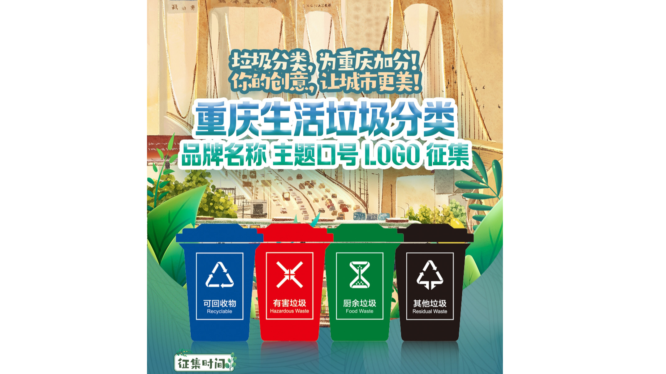 为进一步提升垃圾分类工作的社会认知度和参与度,3月27日,重庆市城市管理局正式启动“重庆生活垃圾分类品牌名称主题口号和LOGO征集活动”,面向全社会征集创意,万元奖金等你来领!