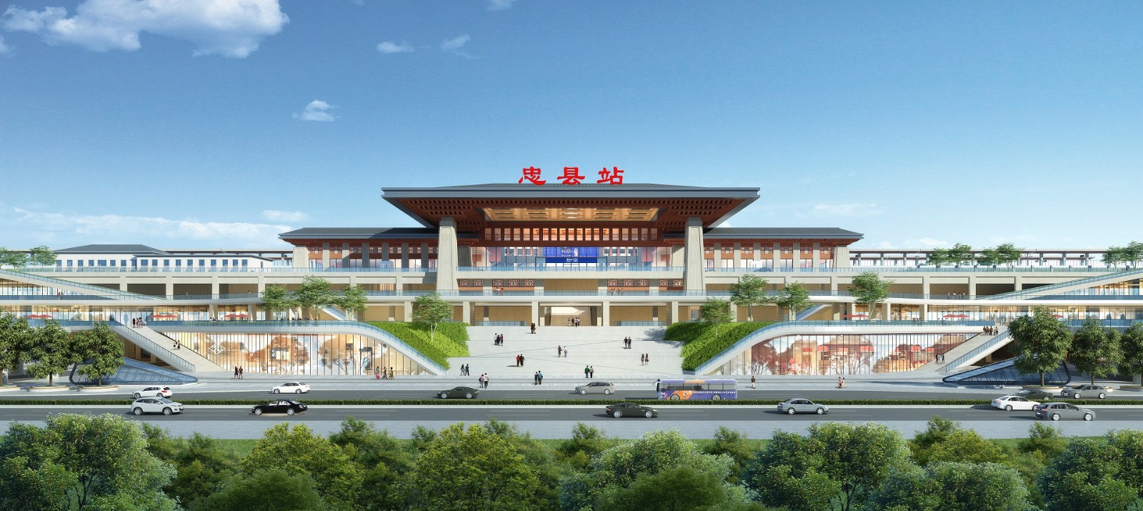 据悉,渝万高铁忠县站综合客运枢纽项目位于重庆市忠县忠州街道南溪半岛,以高铁站房为核心,站前依次设置落客平台、站前广场,两侧设置出租接站区、网约车、社会车、公交大巴车场等配套交通设施,实现铁路、公交、大巴、出租、网约车和社会交通间的高效无缝连接。