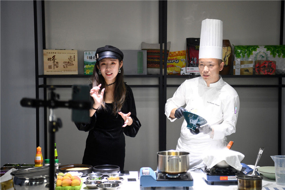 6月28日,在位于重庆巴南的东盟商品集采城内,主播和厨师在进行美食直播。新华社记者 唐奕 摄