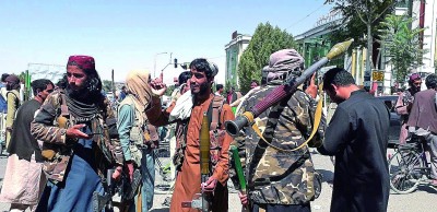 8月12日,塔利班武装人员在阿富汗东部加兹尼省首府加兹尼市街头行走。新华社发