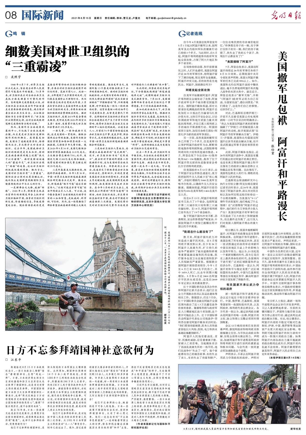 7月,拜登总统表示,美国在阿富汗持续近20年的军事任务将于8月31日结束。近期美国中央司令部发表声明称,美国从阿富汗撤军的任务已完成95%以上。如今,美国和北约在阿富汗战场中黯淡退出,毫不负责地将阿富汗再次抛入战争的水深火热中。就在近日,拜登总统表示“撤军无悔”,并称“(阿富汗)政府军必须为自己而战、为国家而战”,潜台词便是:“我们得走了,这是你们自己的事情,应该你们上。”