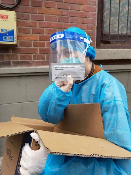 这些情况的叠加给小区最初的防疫工作增加了不少难度,甚至经历了一次“有惊无险”。乐盖曦回忆小区第一次组织抗原自测的场景:“我们向居民发放抗原检测试剂盒,并在微信群里发了如何操作的视频。但有个别居民很紧张,一测完就跑来给我们看结果,‘中队长’、‘小队长’都有!”幸好,在这个过程中,志愿者们都穿着防护服,也保持了足够的距离,没有人被感染或算作密接。”