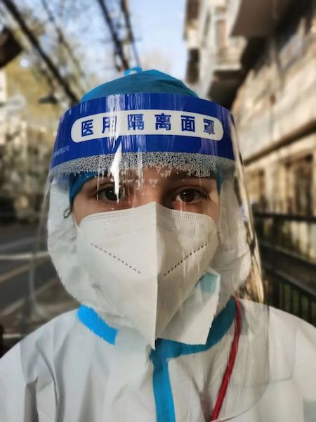 这就是瑞金二路街道陕建居委会的志愿者乐盖曦。这个有着一双坚毅温柔大眼睛的法国姑娘投身上海抗疫已有一个多月。在服务大家的过程中,她也愈发感受到小区大家庭以及这座城市的温暖、团结与美好。