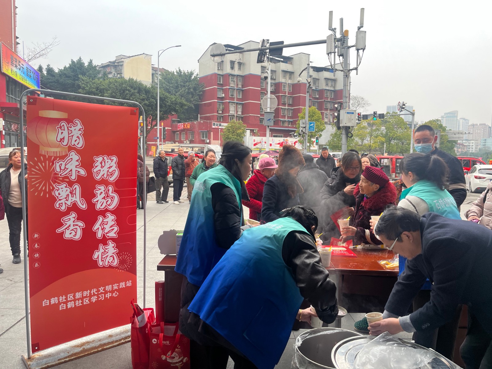 腊八至,年味浓。为弘扬中华优秀传统文化,营造文明和谐、互助友爱的社区氛围,白鹤社区新时代文明实践站携手辖区共建单位农商行,于近日共同组织开展了“腊味飘香,粥韵传情”赠粥暖心活动,为辖区居民送上冬日的温情关怀与节日祝福。