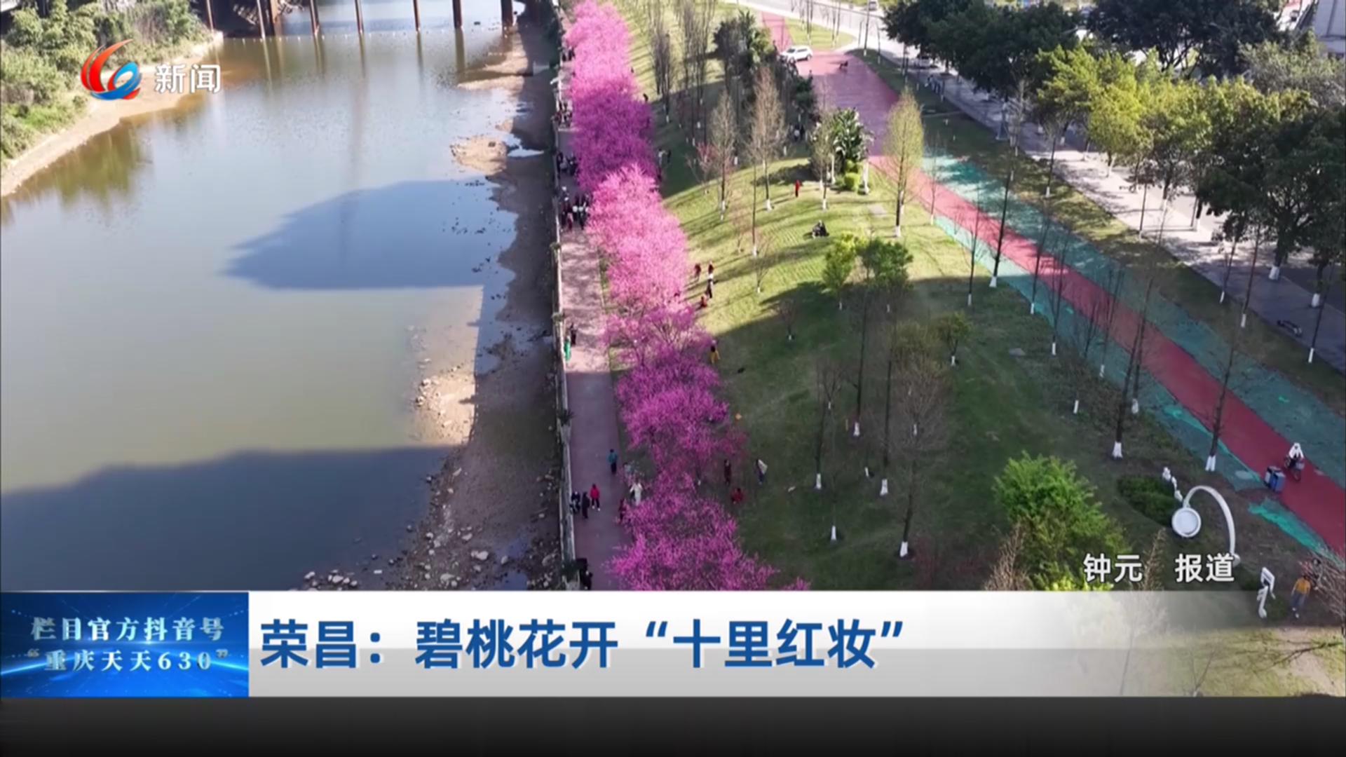 在荣昌城区濑溪河畔,300多株碧桃花沿河岸绵延绽放,放眼望去,粉红的、绛红的花朵层层叠叠,如一条柔美的粉色丝带。阳光下,花树与廊桥、高楼交相辉映,构成一幅生动的春日图景。